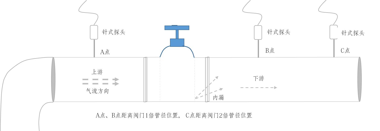 閥門外漏:將N4200Ex超聲波檢測(cè)探頭向需要檢測(cè)的區(qū)域移動(dòng),順序檢測(cè)。當(dāng)從耳機(jī)中聽(tīng)到儀器發(fā)出的音頻信號(hào)急促增加,同時(shí)顯示屏測(cè)試數(shù)值變大,表示已經(jīng)檢測(cè)到泄漏區(qū)域,激光點(diǎn)指示的位置就是泄漏點(diǎn)。 閥門內(nèi)漏:將N4200EX針式探頭傳感器分別接觸閥門上游管徑一倍處和下游管線管徑一倍處(如圖1)。如果顯示屏上的信號(hào)小于或等于A點(diǎn),說(shuō)明閥門沒(méi)有泄漏現(xiàn)象;如果B點(diǎn)的信號(hào)對(duì)于A點(diǎn)有所增加,說(shuō)明閥門泄漏。